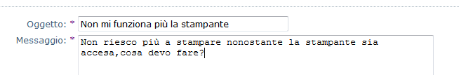 Ora inseriamo un titolo (oggetto) del nostro Ticket, e subito sotto, nel campo "Messaggio" descriviamo il nostro problema o la nostra richiesta: